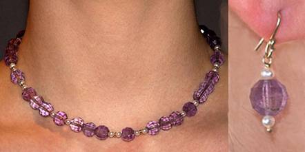 amethyst, freshwater pearl and 9ct yellow gold. 16inch. Necklace code no. Gn1 Price: £69.00Earring code no. Ge1 Price: £20.00 |